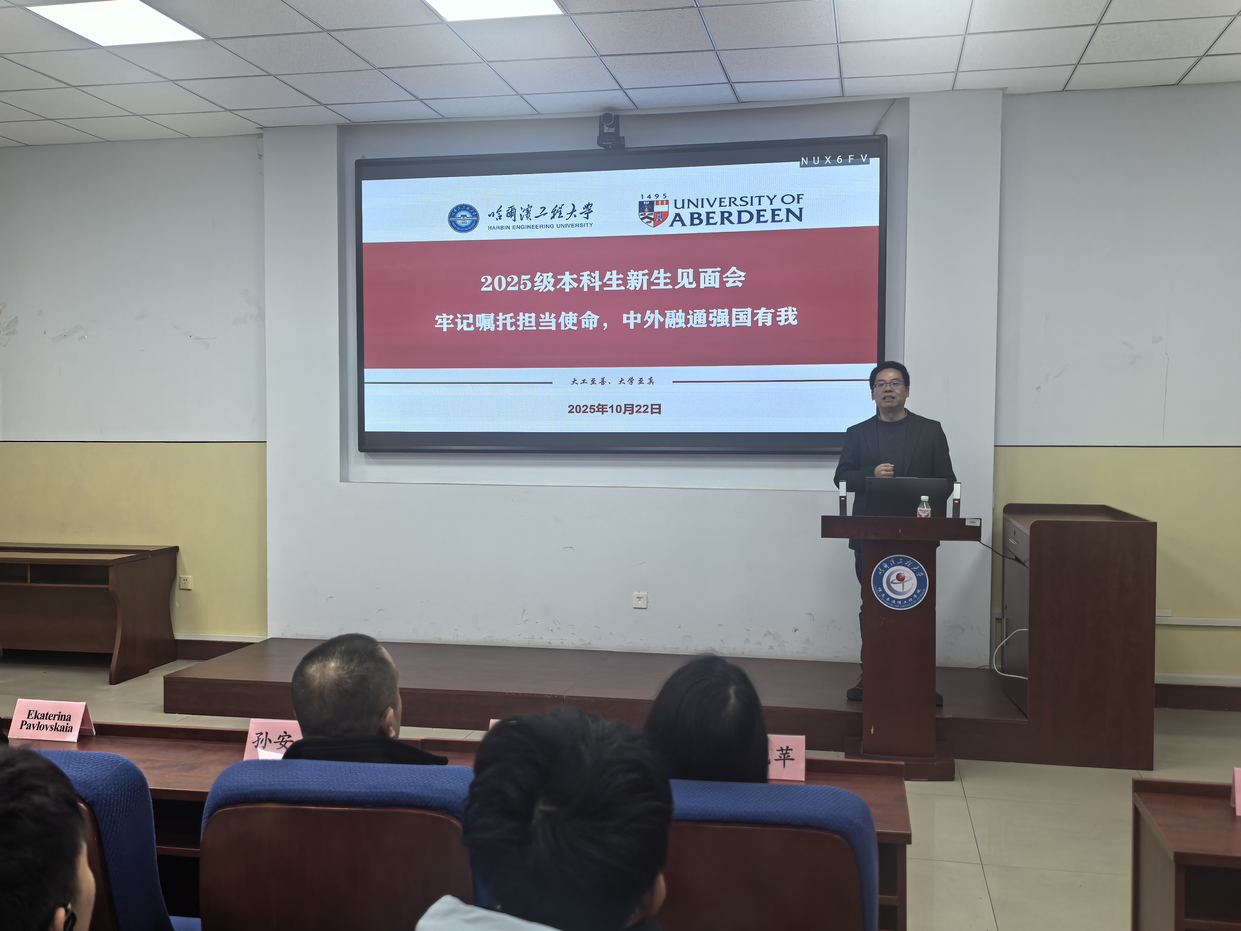 10月22日,信通学院为2025级中外合作办学项目的同学们举办了以“牢记嘱托担当使命,中外融通强国有我”为主题的国际交流活动。阿伯丁大学工学院院长Ekaterina Pavlovskaia一行与同学们进行了深入交流。阿伯丁大学代表Daisy Ma和Daniel Wu两位老师,哈尔滨工程大学国际处国际项目办公室主任牛同利、信通学院副院长乔玉龙、专业负责人廖艳苹教授、教务老师李阳以及辅导员闫桐硕共同参与了此次交流活动。