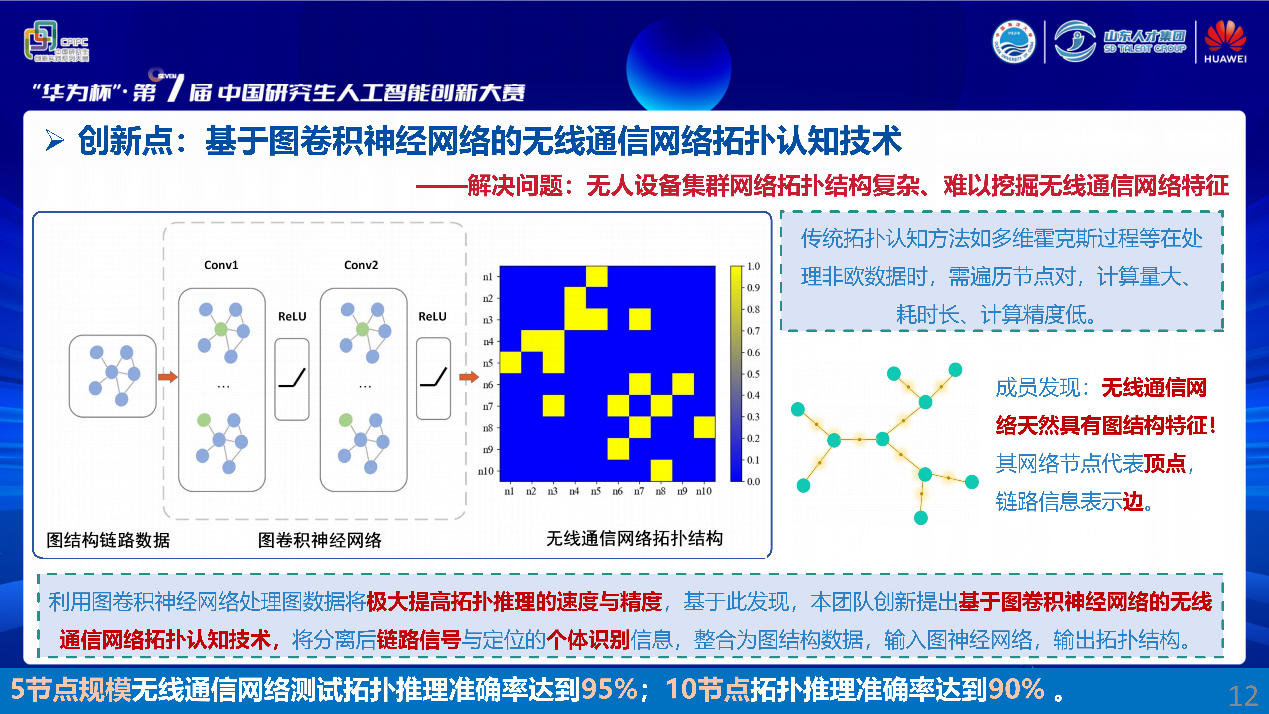 作品简介:无人集群系统背后都有由通信节点和链路组成的无线通信网络,其直观反映了网络的通联情况,是无人集群系统的生命网。透视无线网络拓扑可识别关键节点、判断网络运行稳定性。团队提出无线通信网络拓扑透视仪,并编写了Wi-Fi组网验证算法。采集真实物理层时序信号并发布领域首个数据集,将推动组网拓扑认知技术从仿真验证走向实际应用的关键转变,为组网拓扑认知提供了人工智能新方法。该项目作为全国十五强队伍代表在路演现场展示,得到了专家、参赛其他队伍和观赛人员的一致好评。