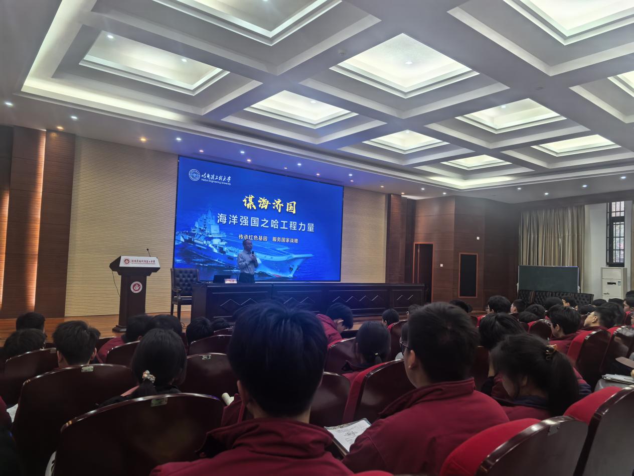 在汉寿一中,赵春晖教授以哈尔滨工程大学的历史文化为主题,深情讲述了学校从“哈军工”到“哈船院”再到“哈工程”的辉煌办学历程,介绍了学校在服务国家“三海一核”(船舶工业、海军装备、海洋开发、核能应用)战略中的突出贡献,激发了同学们对哈工程乃至国防现代化建设的向往与敬仰。