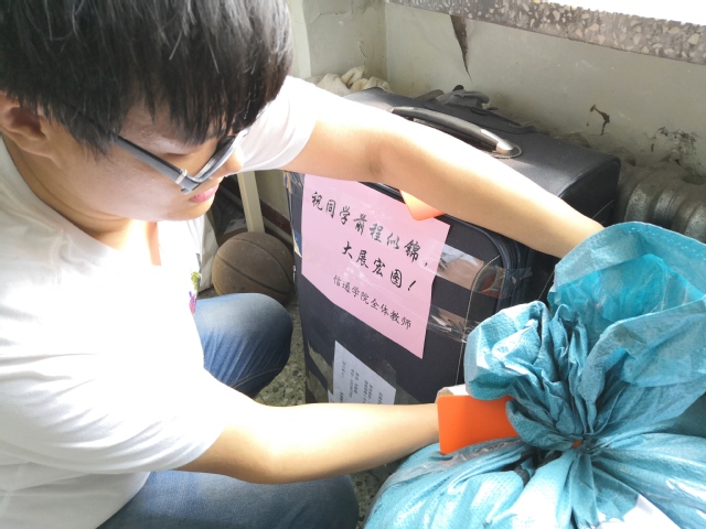 在打包箱的侧面贴有“祝同学前程似锦,大展宏图!”的粉色卡纸,寄托了信通学院全体教师对毕业生的殷切祝福!