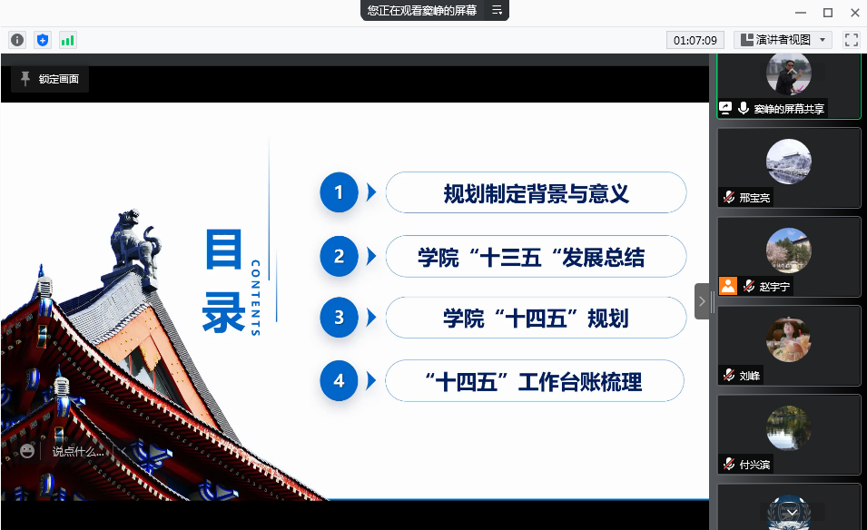 汇报从四个方面进行展开,首先介绍了学院“十四五”发展规划制定的背景与意义。其次,对学院“十三五”期间在师资队伍、人才培养、科学研究、学科平台等方面取得重要性进展和标志性成果作出回顾总结,感谢学院教师的辛勤付出。再次,着重介绍了学院“十四五”发展规划的主要内容,针对目前存在的主要问题,指出学院未来发展的目标、思路及相应的举措,号召全院教师与学院共同进步,砥砺前行,取得更多、更大的成绩。最后,汇报对“十四五”工作台账进行了梳理总结。