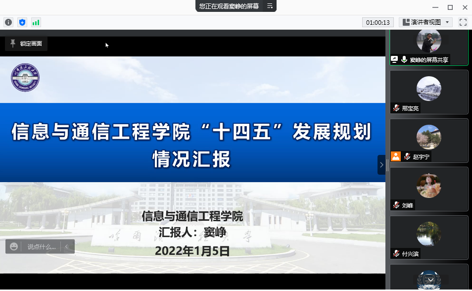 为做好学院第五轮教师岗位聘用工作,认真落实学校“十四五”规划方案和“双一流”二期建设重点工作任务,1月5日,信通学院通过线上召开全院教职工大会,院长窦峥对信息与通信工程学院“十四五”规划方案总体情况进行汇报。学院领导班子成员及全体教职工参加会议。