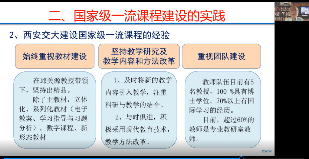罗先觉教授以一流课程建设和教材建设为主题,系统的回顾了我国课程建设和教材建设的历程,并以西安交通大学电路课程为例,对国家级一流课程建设的认识到实践、教材建设的传承与创新,进行深入解读和经验介绍。