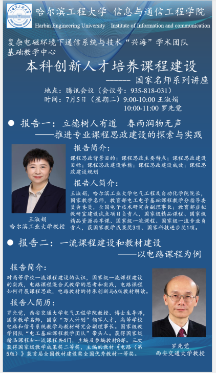 7月5日上午,信通学院复杂电磁环境下通信系统与技术团队与基础教学中心,邀请国家教学名师——哈尔滨工业大学王淑娟教授和西安交通大学罗先觉教授,围绕新工科背景下创新人才培养,开展课程思政和一流课程建设的主题报告。100余位老师参加了本次报告交流活动。