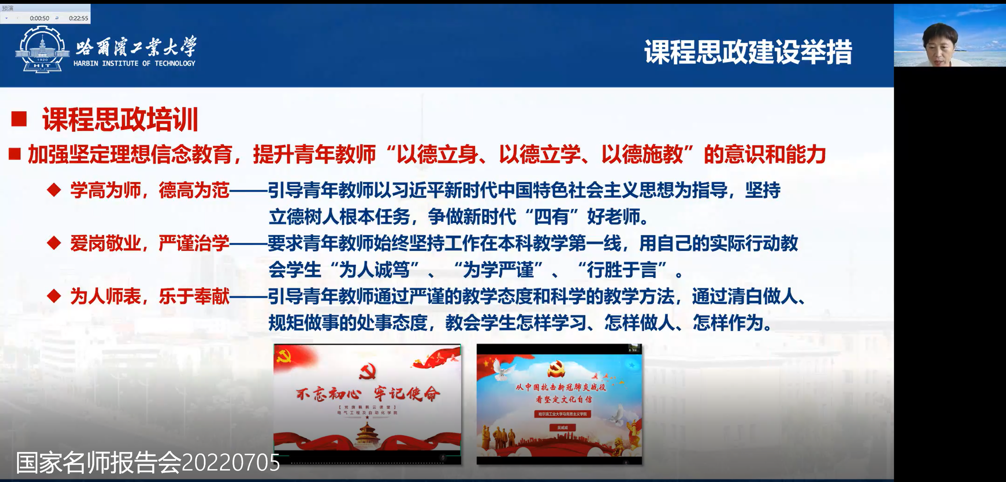 王淑娟教授以立德树人有道,春雨润物无声——推进专业课程思政建设的探索与实践为主题,深入剖析了课程思政的特点和目标,全面介绍了哈尔滨工业大学电气工程及自动化学院的课程思政建设举措、建设成效、建设规划。