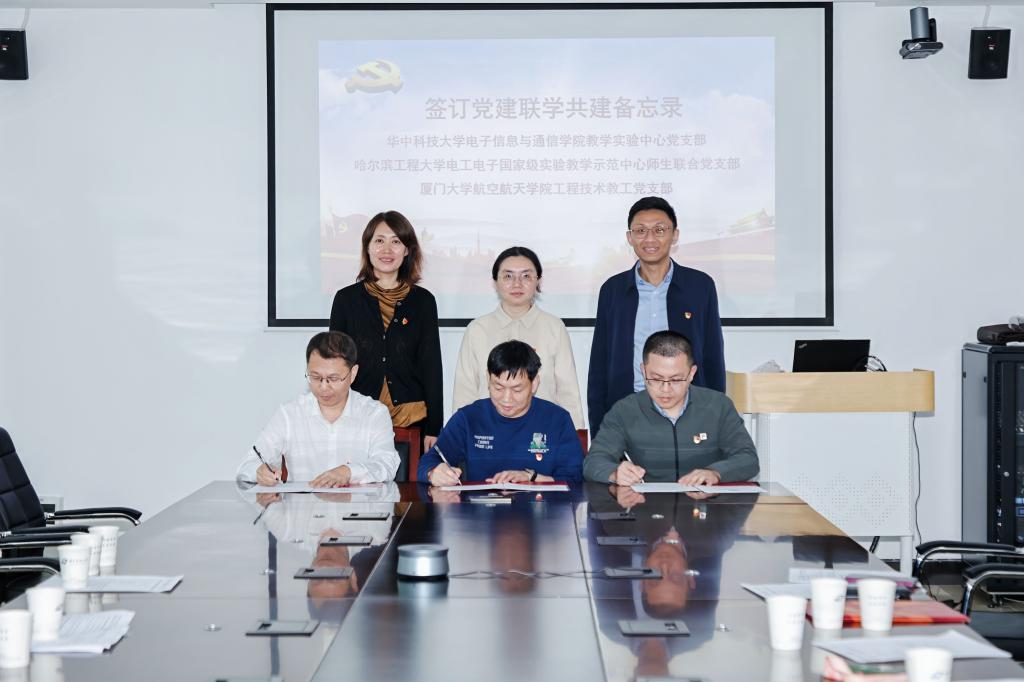在全体参会人员的共同见证下,华中科技大学电子信息与通信学院教学实验中心党支部书记邓天平、哈尔滨工程大学电工电子国家级实验教学示范中心师生联合党支部书记项建弘、厦门大学航空航天学院工程技术教工党支部书记许英杰代表三方签订党建联学共建备忘录。
